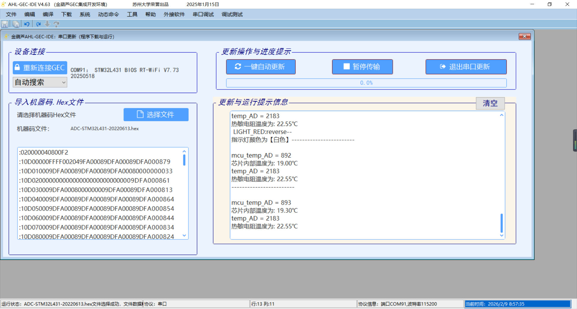 待成功连接开发板后,点击选择文件,选择您要烧录的HEX文件,随后点击一键自动更新即可开始烧录。