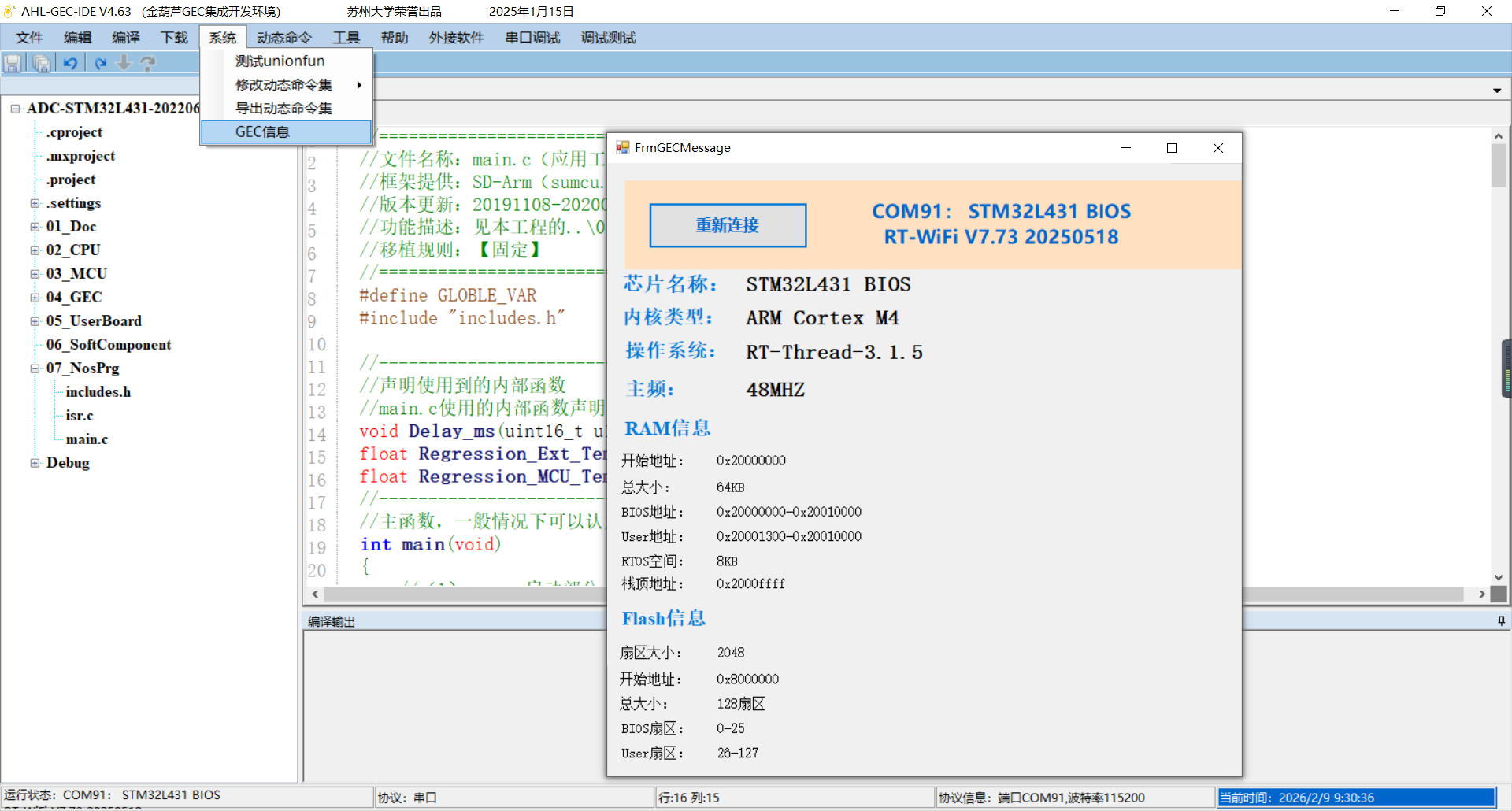 将开发板与电脑连接好后,您可以在AHL-GEC-IDE的上方导航栏中选择系统,找到GEC信息功能。